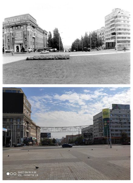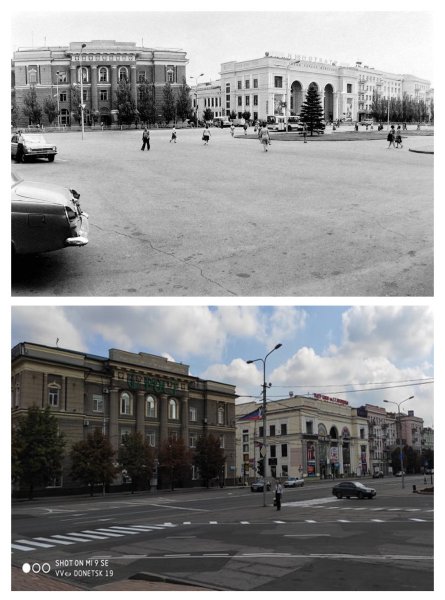 4. Дом советов, «обком» и, наконец, сегодня Ворошиловский райисполком такие имена носило и носит здание, ставшее началом построения композиции центральной площади города Донецка. Именно это здание мы увидим обернувшись назад. Сравним как это место выглядело в 1942-43 гг., в 1960-х и как выглядит сегодня.