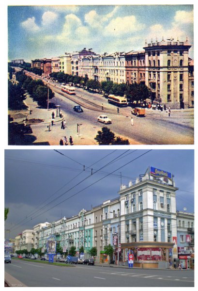 12. Вид с площади Ленина на проспект Ильича. Самые большие изменения в этом ракурсе — исчезнувшие газоны (на их месте выросла плитка) и подросший дом №127 по ул. Постышева. Естественно, что вместо плакатов с лозунгами «Выполним…», «Работаем…» на фасадах теперь реклама.