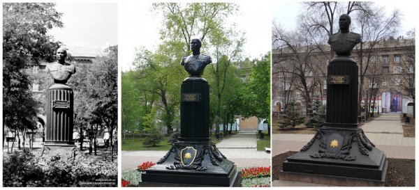 14. Двигаемся в сторону оперного театра. В сквере между пр. Гурова и Театральной площадью находится могила генерал-лейтенанта Кузьмы Акимовича Гурова. Современный памятник на могиле Гурова был установлен 1954 году вместо пришедшего в негодность обелиска. Новый памятник представляет собой бюст К.А. Гурова, установленный на круглый «гофрированный» постамент. Основание постамента выполнено в виде стилобата с барельефами. Памятник отлит из чугуна на Сталинском вагоноремонтном заводе Облкомхоза (сейчас завод «Ремкоммунэлектротранс»). Авторы: скульпторы Ефим Исаевич Белостоцкий и Элиус Моисеевич Фридман, архитектор Н. К. Иванченко.