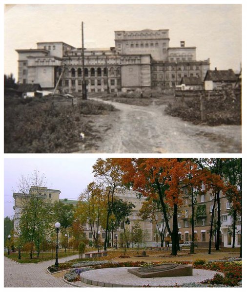 17. Северный сквер Театральной площади в годы оккупации 1941-43 гг. и сегодня. 76 лет назад место сквера выглядело, мягко говоря, неухожено. Остатки частного сектора, хаотичные протоптанные дорожки и дикая неухоженная растительность контрастируют с тем, что мы имеем сейчас.