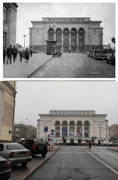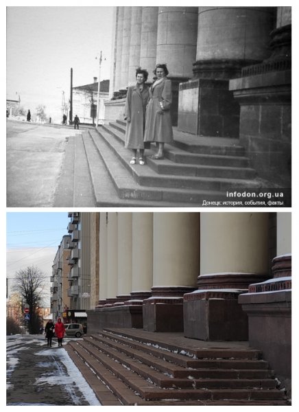 18. Собственно сам «виновник торжества» — театр оперы и балета. Строительство здания в городе Сталино началось в 1936 году, и было связано с генеральной реконструкцией города. А через 5 лет, 12 апреля 1941 года, состоялось открытие театра. Ставили оперу М. Глинки «Иван Сусанин». На фото мы можем видеть театр в первые годы после открытия (1941-43 гг.) и сегодня.