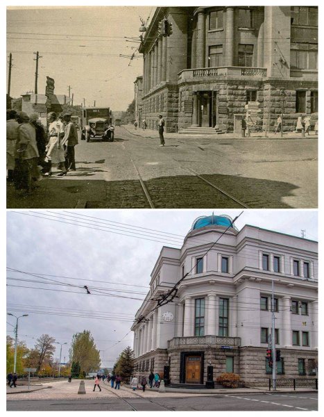 1. Здание банка на пересечении улицы Артема и проспекта Павших Коммунаров было построено в 1929–30 годах для госбанка. И с тех пор практически не изменился как внешний вид, так и предназначение здания. Разве что в начале 2000-х, во время реконструкции, был достроен этаж. На фото мы можем сравнить что было на этом месте в 1942-43 гг. и что тут сегодня.