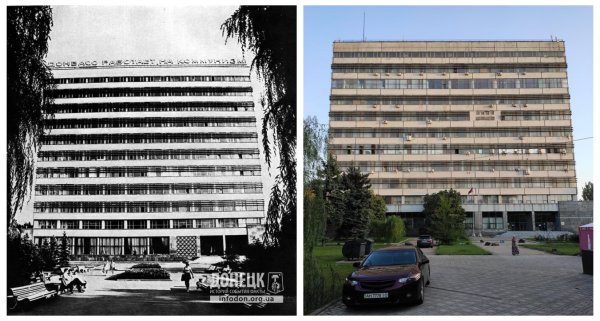 3. Вот мы и добрались до самого центра Донецка — площади Ленина. И первым делом посмотрим на ступеньки бывшего здания Министерства угольной промышленности УССР. Само здание, построенное в 1956 году, практически не изменилось, а вот окружающий его частный сектор исчез.