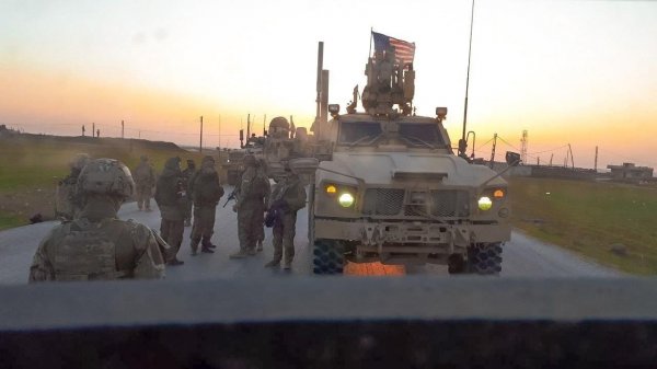 Снимок опубликовал Telegram-канал "Вежливые люди". На нем представители российской военной полиции общаются с американцами у бронемобиля с флагом США. Как уточняется, встреча произошла во время патрулирования провинции Хасака.