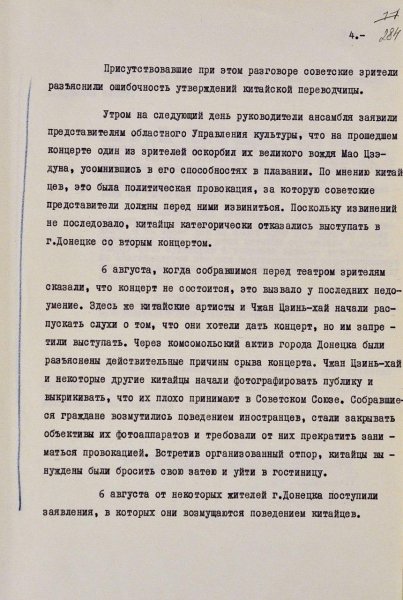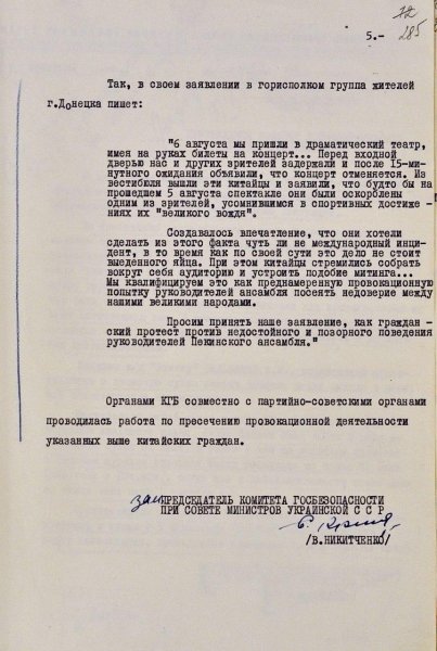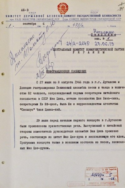На этом фоне и проходил визит Пекинского ансамбля песни и танца в Донецк в августе 1966 года. Из рассекреченного информационного сообщения Председателя комитета госбезопасности при совете министров УССР В. Никитченко в ЦК компартии Украины мы узнаем подробности пребывания китайцев в Донецке.