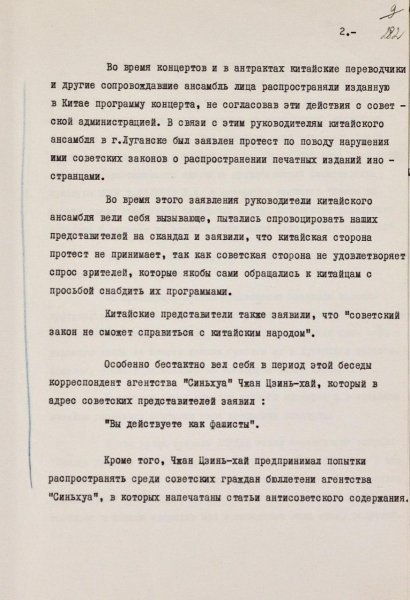 Во время этого заявления руководители китайского ансамбля вели себя вызывающе, пытались спровоцировать наших представителей на скандал и заявили, что китайская сторона протест не принимает, так как советская сторона не удовлетворяет спрос зрителей, которые якобы сами обращались к китайцам с просьбой снабдить их программами.