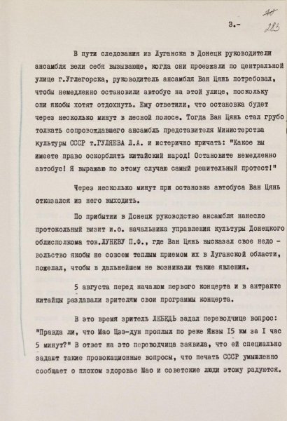 В пути следования из Луганска в Донецк руководители ансамбля вели себя вызывающе, когда они проезжали по центральной улице г.Углегорска, руководитель ансамбля Ван Цянь потребовал, чтобы немедленно остановили автобус на этой улице, поскольку они якобы хотят отдохнуть. му ответили, что остановка будет через несколько минут в лесной полосе. Тогда Ван Цянь стал грубо толкать сопровождавшего ансамбль представителя Министерства культуры СССР т. ГУЛЯЕВА Л.А. и истерично кричать: «Какое вы имеете право оскорблять китайский народ! Остановите немедленно автобус! Я выражаю по этому случаю самый решительный протест!»