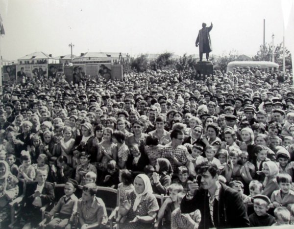 Космонавт Герман Титов выступает на торжественном митинге на шахте Пролетарская-Глубокая в Макеевке. Справа от супруги космонавта — В. Дегтярев