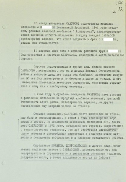 Отбывая наказание, САВРАСОВ часто жаловался на головные боли и головокружение, в связи с этим неоднократно обращался к врачам. По заключению начальника медслужбы ИТК, лечившего САВРАСОВА в 1972 году, последний мог страдать неврастенией с гипертоническим синдромом, что при отсутствии систематического лечения и употребления наркотиков и алкоголя могло привести к осложнению заболевания и к явлениям реактивного психоза.