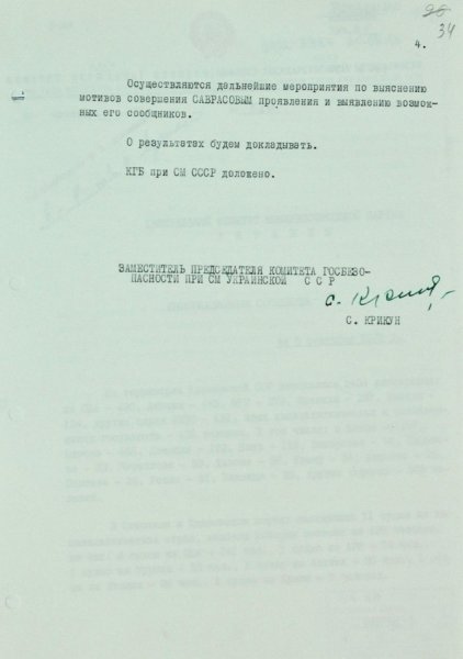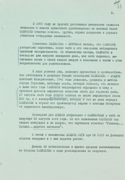 В связи с изложенным ХОХЛОВ УКГБ при СМ УССР по Донецкой области задержан и с ним ведется работа. Данных об антисоветских и идейно вредных высказываниях со стороны САВРАСОВА в ходе расследования не получено.Осуществляются дальнейшие мероприятия по выяснению мотивов совершения САВРАСОВЫМ проявления и выявлению возможных его сообщников.