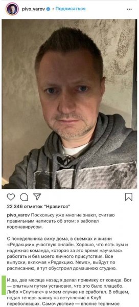 Журналист Алексей Пивоваров заразился коронавирусом, сообщает канал "Без рецепта". Он продолжает работать удаленно, самочувствие называет терпимым и обещает своевременный выход своей программы "Редакция". Пивоваров также сообщил, что 2 месяца назад вакцинировался "Спутником V", но теперь полагает, что ему вкололи плацебо либо препарат в его случае не сработал.