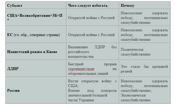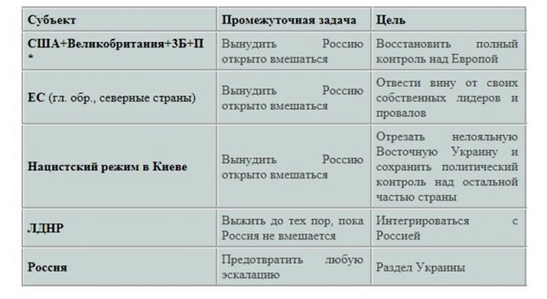 Первое, что мы замечаем, это то, что три главных актора (США, Великобритания, Прибалтика и Польша, а также ЕС и Украина) хотят заставить Россию вмешаться. Почему? Потому что, как я уже писал миллион раз, цель состоит не в том, чтобы победить Россию военным путем; цель состоит в том, чтобы победить Россию политически. Любое российское вмешательство будет использовано англосаксами, чтобы «доказать», что «НАТО жизненно важна для европейской безопасности», а прибалтийско-польско-украинская банда докажет свою полезность своим англо-хозяевам.