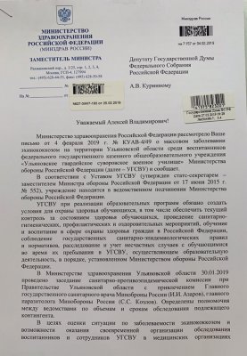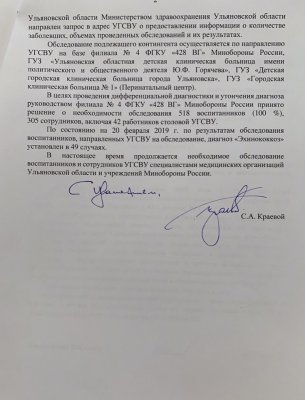 Как говорится в письме Минздрава депутату, принято решение об обследовании 518 воспитанников, 305 сотрудников, включая 42 работников столовой училища. Оно проводится в ульяновском военном госпитале Минобороны, областной детской клинической больнице, городской детской клинической больнице Ульяновска и на базе городской клинической больницы №1.