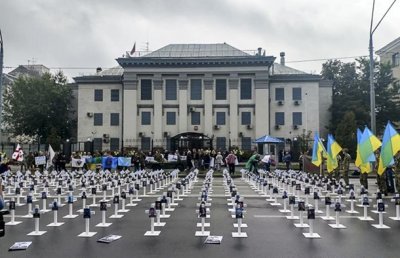 Также активисты провели акцию у посольства РФ, установив на проезжей части сотни крестов с фотографиями погибших.