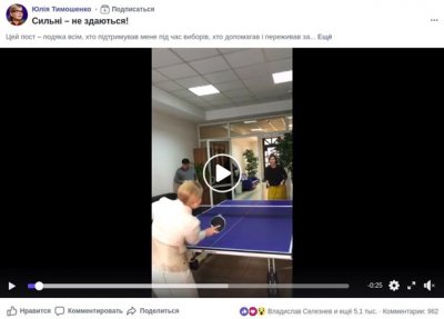 Тем временем Тимошенко решила показать, что тоже умеет играть в настольный тенис. Напомним, что после объявления первых результатов, по которым лидировал Зеленский, шоумен у себя в штабе играл в пинг-понг.