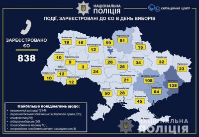 За пять часов голосования в полицию поступило 838 сообщений о нарушениях. Больше всего - из Донецкой и Днепропетровской областей.
